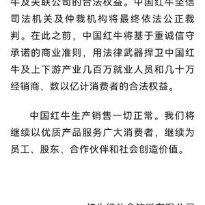 2022年12月29日,中国红牛披露,收到深圳前海合作区人民法院判决认定,广东省深圳前海合作区人民法院认定“50年协议书”第一条有效,只有中国红牛有权在中国境内生产、销售红牛饮料,未经书面同意或许可之前,泰国天丝不得在中国境内生产或承包给其他公司生产或销售红牛饮料同类产品。