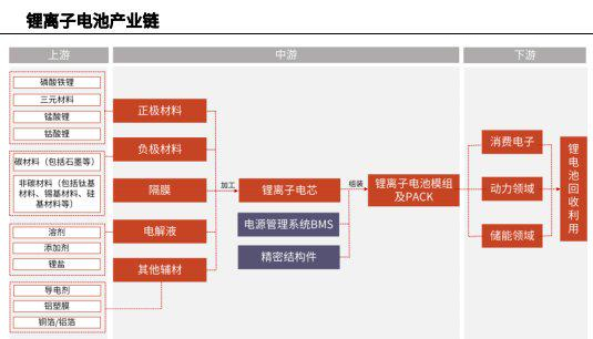 锂电池行业产业链经过近二十年的发展,已经形成了专业化程度高、分工明细的产业链体系。上游是基础原料,中游涵盖电池材料、锂离子电芯、锂电池模组及PACK,下游包括三大应用领域与锂电池回收利用。