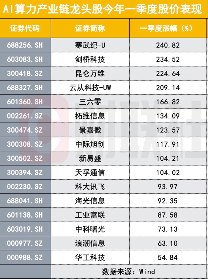 毫无疑问,从股价涨幅来看,AI算力产业链也成为最为受益的板块,AI芯片、AI服务器、光模块、大模型等细分方向龙头股涨幅惊人。AI芯片龙头寒武纪,大模型龙头剑桥科技、昆仑万维、云从科技等个股今年一季度涨幅翻了两倍;三六零、拓维信息、景嘉微、中际旭创、新易盛、天孚通信等涨幅超过一倍。