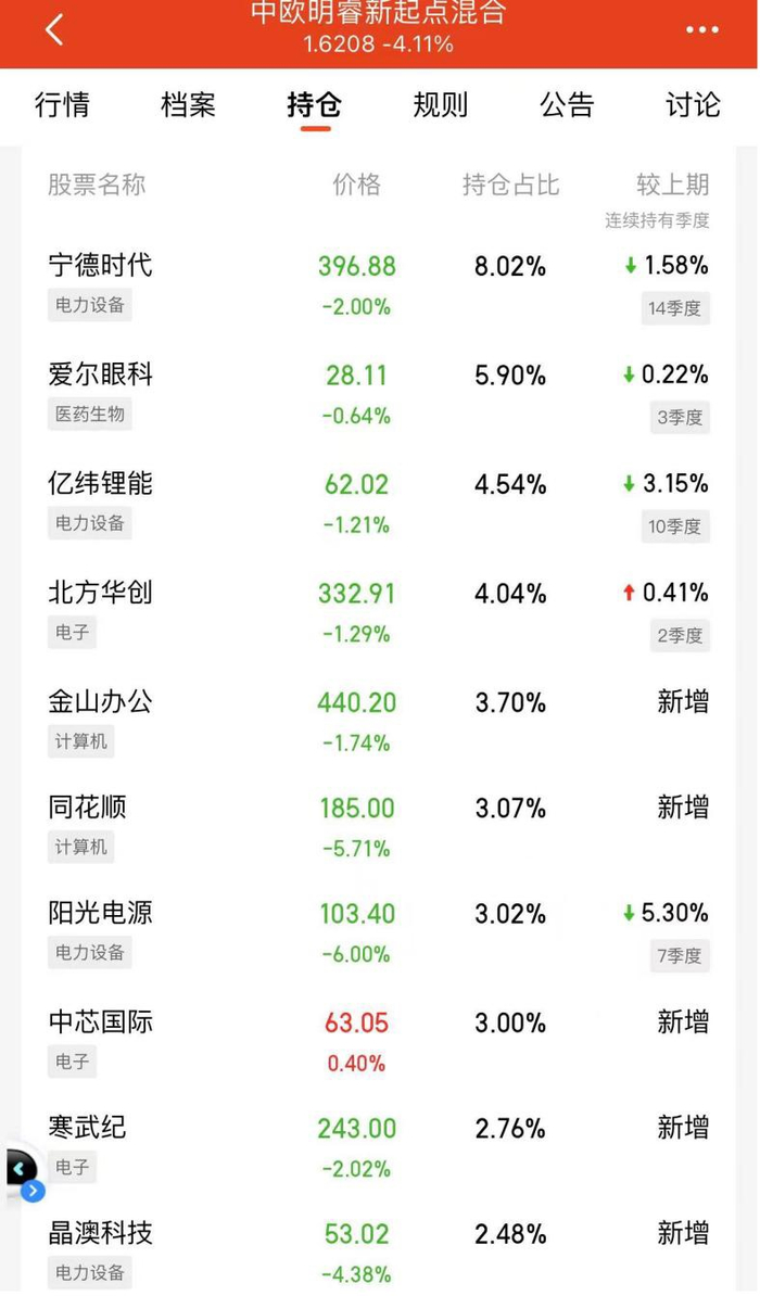 一季报披露后,盲盒开启,寒武纪果真现身葛兰管理的中欧明睿新起点混合的第9大持仓股,从持仓来看,“数亿”是以讹传讹的夸张说话,当前葛兰持有寒武纪28.53万股,持仓市值为5305.56万元。
