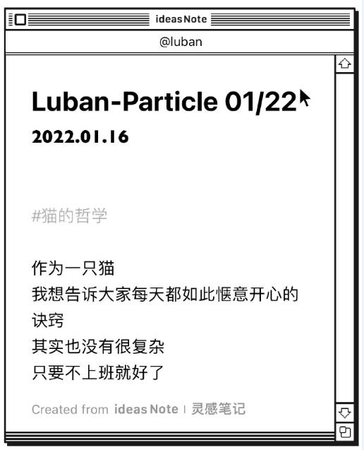 从2020年开始,鲁般在自己的微博上坚持每天发几行日常随笔,有些是对某个场景的观察,有些是生活感想,还有以他的宠物猫的口吻写出的“猫的哲学”,这些都是他的“碎片(partical)”系列,不为集结发表,只为坚持记录。