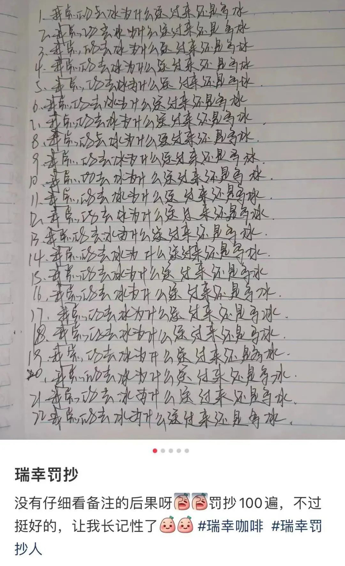 对于罚抄行为,瑞幸客服对记者表示,