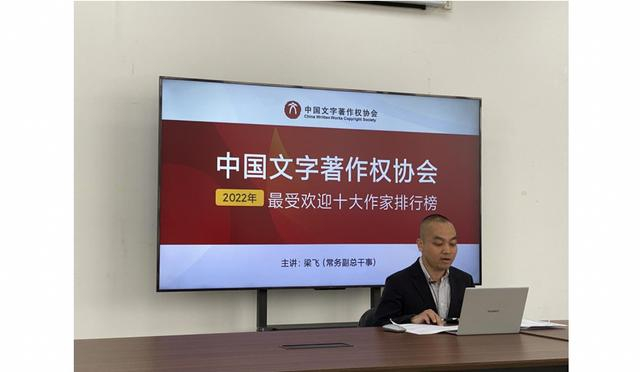 梁飞在《2022年度最受欢迎十大作家排行榜》《中国文字著作权协会2022年年报》发布会现场公布2022年度最受欢迎十大作家排行榜榜单(主办方供图)。