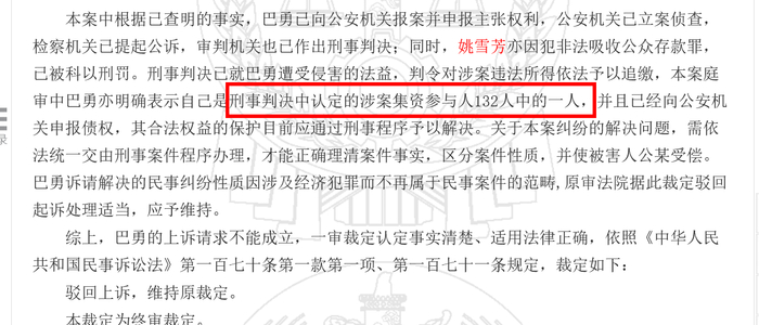 姚雪芳所涉及的“非吸”涉及多少受害者?财联社记者依据中国裁判文书网的公开信息找到了答案。据一份由河南省郑州市中级人民法院作出的“巴勇、中国农业银行股份有限公司巩义市支行储蓄存款合同纠纷二审民事裁定书”显示,姚雪芳因犯非法吸收公众存款罪,已被科以刑罚。相关刑事判决认定,涉案集资参与人达132人。