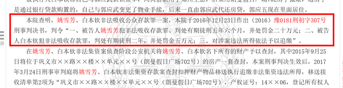 有文书显示,警方介入后,姚雪芳因犯非法吸收公众存款罪,已被巩义市人民法院判处有期徒刑五年六个月,并处罚金二十万元。财联社记者注意到,此处一并被提及的白本钦近期也被河南省银保监局给予禁止从事银行业工作两年的行政处罚。