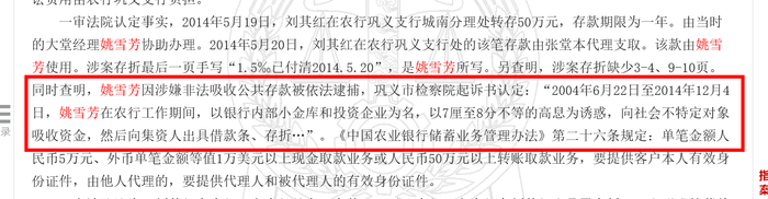 姚雪芳涉及的非法吸收公众存款的总金额有多少?中国裁判文书网的诸多文书中均没有相关信息。不过,案号“(2018)豫民再689号”文书显示,2014年5月19日,刘其红在农行巩义支行城南分理处转存50万元,存款期限为一年。由当时的大堂经理姚雪芳协助办理,后该款项同样被姚雪芳利用他人取出转给自己使用。结合上述多个文书初步统计,姚雪芳案件涉及“非吸”金额至少在百万以上。
