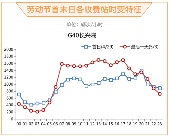 节前一天下午至晚间,预计G40长江隧桥、G1503高东入口、G2江桥、G50徐泾、G60新桥主线等部分射线高速公路出城方向流量仍将较为集中,并引发时段性、方向性拥堵。节日首日出行高峰预计出现在10时至14时,出行主体为自驾游出行者,届时部分射线高速公路出城方向、新城及景点周边匝道流量将明显上升。假期最后两天返程车流持续增长,预计节日最后一天15时至19时,部分射线高速公路入城段如G2京沪、G40沪陕长江桥隧、G50沪渝、G60沪昆等将出现方向性拥堵。省界道口方面,预计上海高速及地面道路省界道口总流量450至475万辆次,日均流量在90至95万辆次,与2021年同期相比增幅在4%至9%之间,较2019年同期增长1%至6%。快速路方面,预计车流规模日均流量在195至205万辆次,与2021年同期相比增幅在3%至8%之间,较2019年同期增长9%至14%。小长假首、末日受射线高速公路车流集中出行影响,与其衔接的快速路段将出现方向性拥堵。比如,首日出城方向受S5嘉定方向拥堵影响,中环外侧广粤路至沪嘉立交将出现拥堵;受G2沪宁江苏方向拥挤影响,中环外侧铜川路至武宁立交匝道将出现拥堵;受G50沪渝江苏方向拥挤影响,延安北侧江苏路至延西立交、延西立交至虹许路、虹许路至虹桥枢纽均出现不同程度拥堵。最后一天返程车流将对中环西段和北段、延安高架入城方向等区段造成较大通行压力。节假日常态性拥堵区域G40长江隧道,预计劳动节期间日均流量为10.8万辆次/日,较2021年同期增长约5%。其中上行(江苏方向)5.2万辆次,下行(市区方向)5.6万辆次。流量最大时段为8时至11时,平均小时流量达6400辆次,次高峰为13时至15时,平均小时流量达6000辆次。