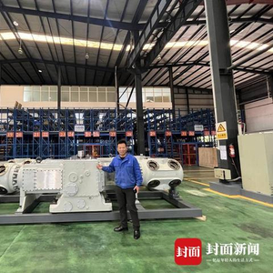 4月24日上午11时许,记者跟随甘新伟来到生产车间,吊车正在将几台大型设备搬运到重卡上。原来,后天(4月26日)就是成都国际工业博览会启幕,作为展商之一的金星集团,其车间“航母级”的设备将亮相博览会。