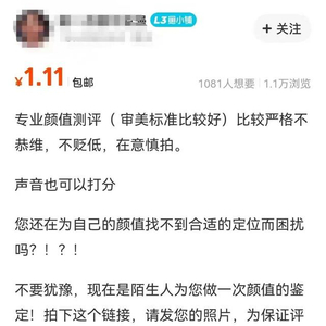 谁来评分?如何打分?半月谈记者总结各个购物平台上此类商品信息发现,卖家身份各有不同:有的自称是从业多年的专业化妆师,可从专业角度提供颜值分析服务;有的自称“绝对路人”,强调陌生人视角的颜值评价;有的自称在校大学生,从初恋角度看颜值高低;有的则以异性审美为卖点,自诩“钢铁直男(女)”……他们都宣称自己“客观公正”“不吹彩虹屁”。