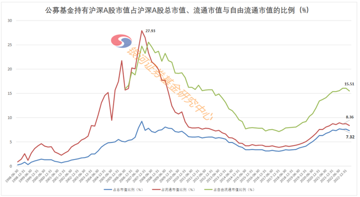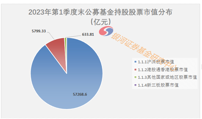2023年1季度末,公募基金持有5.73万亿A股市值,占A股总市值比例是7.32%,占A股流通市值比例是8.36%,占A股自由流通市值比例是15.51%.