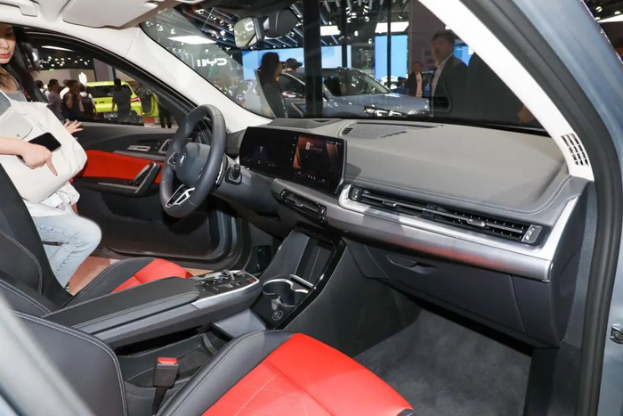 内饰方面,全新宝马X1采用宝马家族最新设计语言,10.25英寸全液晶仪表盘与10.7英寸中控多媒体显示屏相连接的双联屏设计,并内置宝马最新的iDrive 8车机系统,在中控台下方有一个空间巨大的手机无线充电面板和两个杯架,并配备拨杆式的电子换挡机构。另外,新车的空调出风口设计也较为独特,中央是一个一体式造型,副驾驶则是一个双排的贯穿式设计。