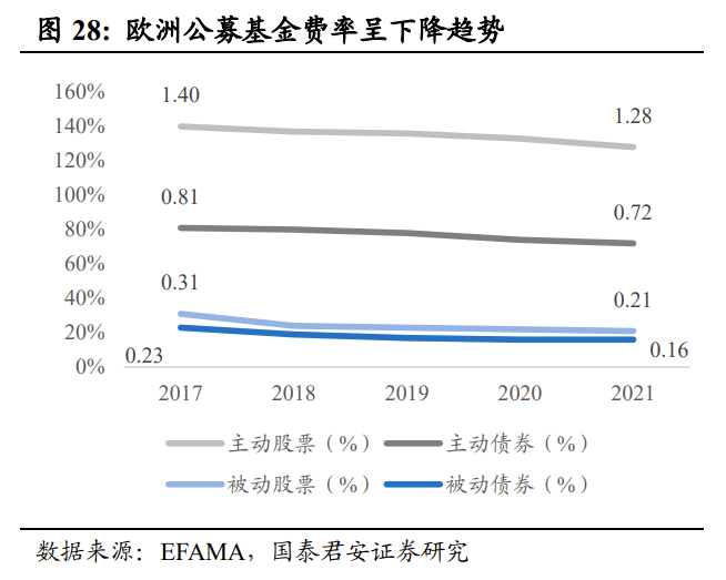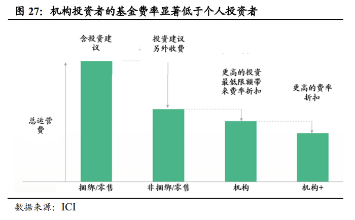 欧洲市场个人投资者的基金费率高于机构投资者,机构投资者占比提升导致公募基金的平均费率呈下降趋势。在欧洲市场,不同投资者的基金费率不同,个人投资者的基金费率中含较高的分销渠道费(Distribution),费率高于机构投资者。即使是对于已经禁止支付渠道佣金的英国和荷兰等国,机构投资者仍然因投资规模较高享有费率折扣。2020年欧洲金融监管机构表示,个人投资者的基金投资成本平均比机构投资者高出40%。