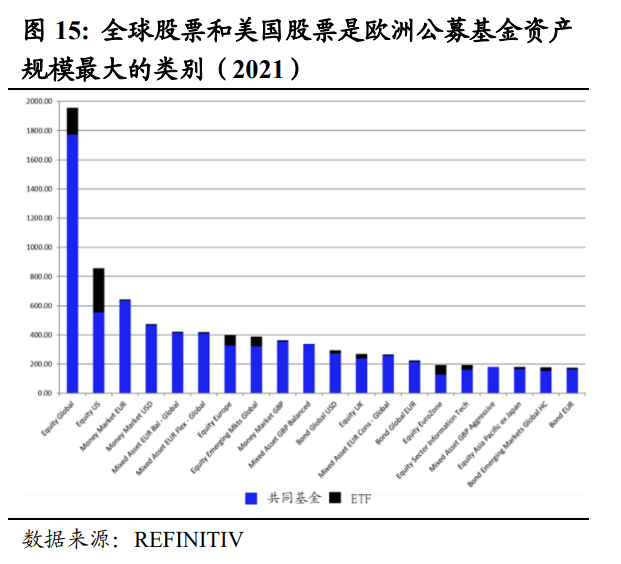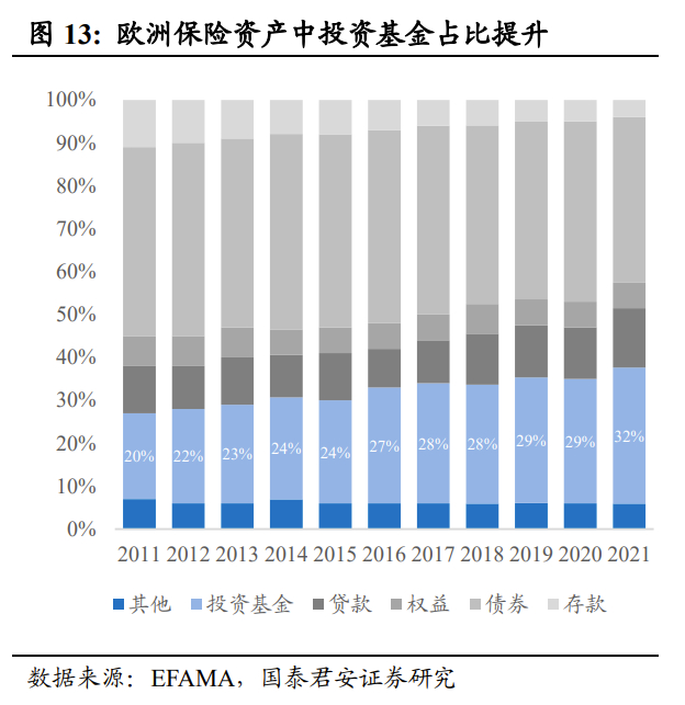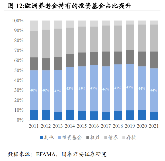 为提升投资收益,养老金等机构投资者增配了美国股票和全球股票型公募基金,从而推动公募基金整体规模提升。1)养老金等机构投资者以投资基金取代了债券、存款等固定收益类资产,在一定风险水平下,提升了投资收益。截至2021年底投资基金占欧洲养老金规模的44%,占保险资产规模的32%;2)欧洲公募基金更多应用于美股和全球股票的投资。美国股票型公募基金占股票型基金的比重从2011年的20%提升至2021年的41%;目前排名欧洲前二的公募基金类别分别为全球股票型和美国股票型。
