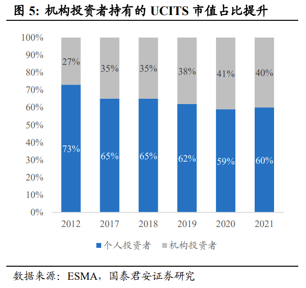 2000年以来欧洲公募基金规模持续高速增长,前期增长由个人投资者的财富保值增值需求驱动,后期由机构投资者提升投资收益的需求驱动。1)欧洲公募基金资产规模从2000年的3.3万亿欧元增长至2021年的23.2万亿欧元,21年来年均复合增速10%。2)金融危机以前,机构投资者持有的UCITS占比较低,基金规模增长主要由个人投资者财富保值增值的需求驱动;金融危机后,机构投资者持有的UCITS市值占比呈提升趋势,对基金规模的增长具有主要贡献。