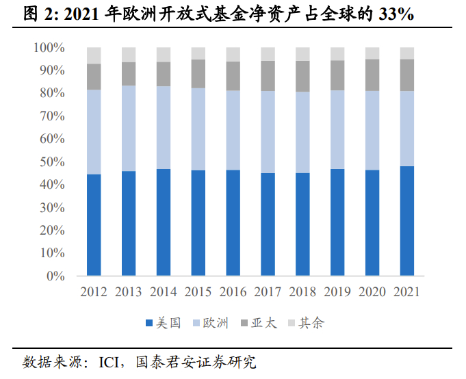 欧洲公募基金起源于满足个人投资者的财富保值增值需求,近年来规模增长主要受机构投资者提升收益需求的驱动。2000-2021年欧洲公募基金资产规模年均复合增速10%,机构投资者持有的UCITS占其净资产比从2012年的27%提升至2021年的40%。1)19世纪中后期,欧洲公募基金起源于满足个人投资者的财富保值增值需求;2)20世纪后期,欧洲资本市场的证券化提升了公募基金对居民的吸引力;3)养老金制度改革后,机构投资者产生了提升投资收益的需求,现阶段主要通过公募基金投资美股。