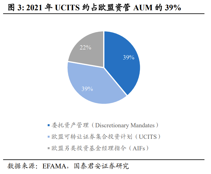 欧洲公募基金以UCITS为主框架,是欧洲资管行业的重要工具。在欧洲,符合欧盟可转让证券集体投资计划条例(UCITS)的投资基金类似于国内的公募基金。UCITS需满足严格的投资范围及风险分散要求。2021年欧洲开放式基金净资产占全球的33%,UCITS规模占欧洲资管的39%。