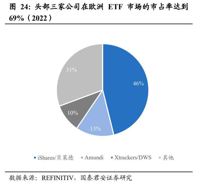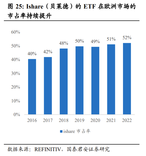 头部公司的ETF产品主要优势在于更具流动性,流动性得益于其全球并购战略,扩大了投资者基础。1)Blackrock/Ishare通过并购分别获得德国市场、英国市场以及瑞士市场业务,结合本身在美国市场的突出地位,形成跨国ETF经营格局。在各地市场已有产品规模的基础上,贝莱德为欧洲机构推出高流动性的ETF产品,在欧洲市场取得竞争优势。其面向美欧投资者的iShares Core ETF系列凭借其广泛的投资者基础,更具流动性优势。法国ETF品牌Lyxor ETF则通过收购德国商业银行的ETF部门ComStage获得德国市场业务,提升了ETF规模。而Amundi则通过收购Lyxor ETF成为欧洲新的第二大ETF发行人。2)高流动性产品更具吸引力,头部基金公司市占率持续提升。在欧洲ETF市场,三家头部公司的ETF市占率达到69%。规模具有绝对优势的贝莱德Ishare在欧洲ETF市场的市占率持续提升,在2022年底已经达到52%。