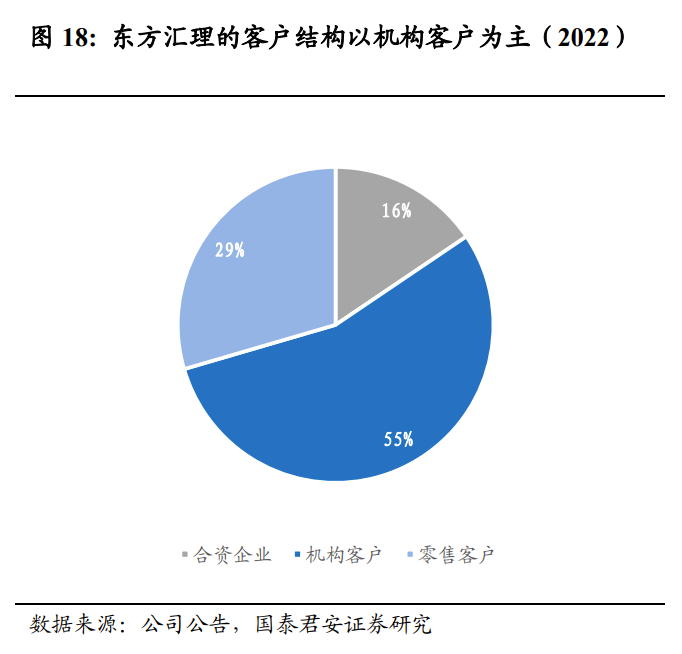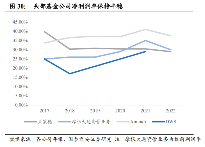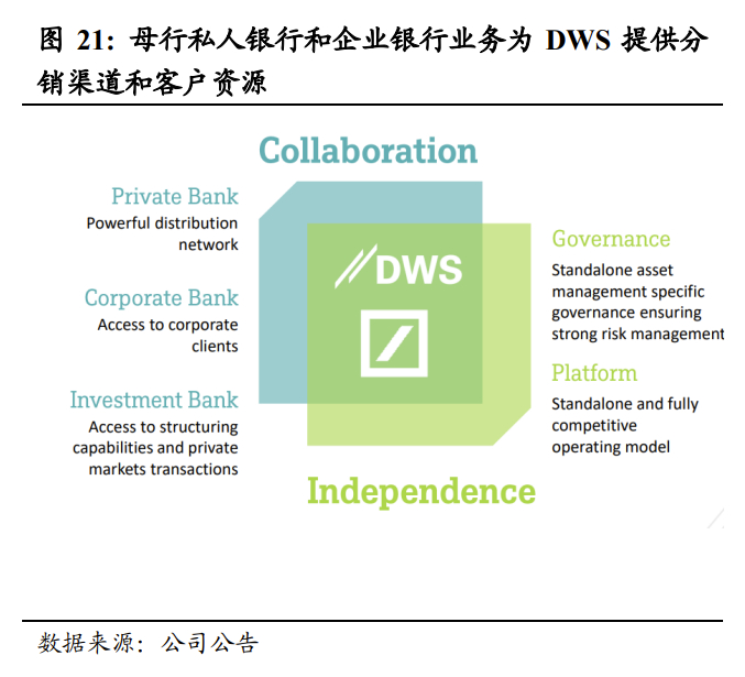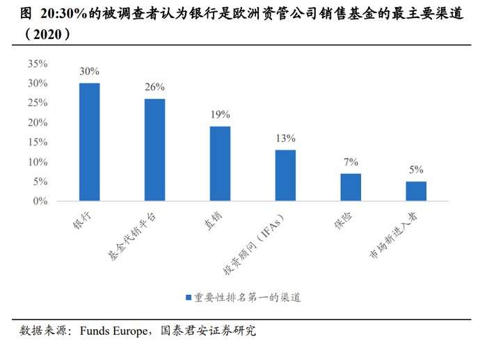 在欧洲,银行是公募基金销售最重要的渠道,头部基金公司自身或集团的银行和财富管理业务为基金销售提供优质渠道,机构客户占比的提升弱化了其渠道优势。1)欧洲的大多数投资者历来依赖顾问和银行来推荐产品并充当中介。根据ESMA的调研,对于向零售客户销售的UCITS,大多数欧洲国家中银行在分销渠道中占比超过50%。Funds Europe的调研显示,30%的被调查者认为银行是欧洲资管公司销售基金的最主要渠道。头部公司以银行系为主的股权或业务结构,能够发挥在银行业务和财富管理业务方面的渠道优势,提高头部基金公司的渠道能力。DWS的母行私人银行和企业银行业务均为其提供分销渠道和客户资源,东方汇理的资管AUM中仍有49%来自母行;2)然而,机构投资者通常直接从基金公司购买基金,随着机构客户占比的提升,头部公司的渠道优势弱化。
