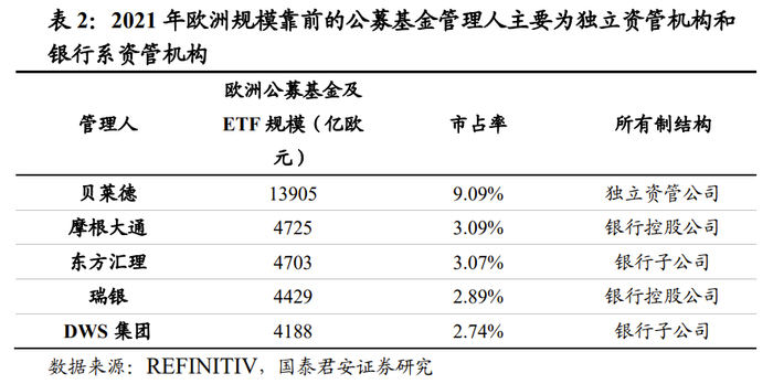 欧洲市场上规模排名前列的公募基金管理人主要是独立资管机构和银行系资管机构。管理人是指从事管理一个或多个UCITS或 AIF 业务的机构。从基金管理方式上来看,UCITS可以是投资公司,进行内部管理或由管理人管理;也可以设定为投资基金,始终指定外部管理公司管理。目前欧洲公募基金及ETF规模排名前列的基金管理人主要包括贝莱德、摩根大通、东方汇理、瑞银、DWS集团,以独立资管机构和银行系资管机构为主。