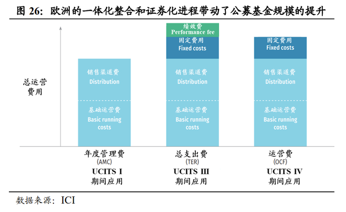 目前,欧洲公募基金收取的主要是运营费(Ongoing charges, OCF),涵盖基础运营费用(Basic running costs)、销售渠道费(Distribution)和固定费用(Fixed cost),均基于基金规模收取。1)基本运营费用主要用于覆盖员工工资、研究成本和其他类似的基本运营成本分配;2)销售渠道费是基金为其服务向分销商支付的费用。一些欧盟国家禁止对新的/现有的基金份额收取此类费用;3)固定费用主要覆盖行政管理费、托管费、审计费、转让代理费、法律费和监管费等费用。
