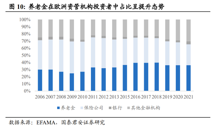 21世纪初,欧洲国家的养老金制度改革使养老金规模提升,并且产生了提高投资收益率的需求。21世纪初期,德国、法国、西班牙、意大利和其他欧洲国家主要依赖现收现付的国家养老金制度,随着退休人口的增加和劳动力的减少,很快将面临重大的财政负担。德、法等国政府均对养老金制度进行改革,鼓励员工通过私人计划来补充政府退休金。同时,为提高养老金收益率,欧盟出台立法,允许私人养老基金计划将其高达70%的资产投资于股票,并且允许欧洲养老基金经理根据“谨慎的人(Prudential Person)”标准,自由投资多元化的证券组合。养老金规模提升并逐渐成长为欧洲资产管理行业规模最大的机构投资者。截至2021年底,养老金占欧洲机构投资者AUM比重的36%,高于保险公司的29%。