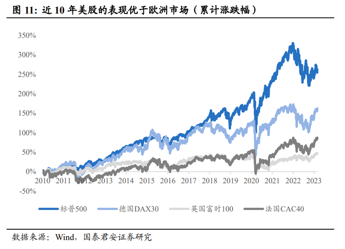 金融危机后,通过公募基金投资于美股能够提高投资收益。1)近年来随着欧洲利率水平的下降,养老金等机构投资者已无法获得具有确定性高收益的资产,需要将部分资产转向回报率更高的投资上;2)金融危机以后,美股行情持续好于欧洲各国股市,特别是2020年底,美股的复苏相较其他国家更为强劲,吸引了欧洲机构资产的流入;3)养老金和保险资金的投资都具有较低的风险偏好,通过公募基金分散投资于美股能够分散投资风险,优于直接投资美国股票。