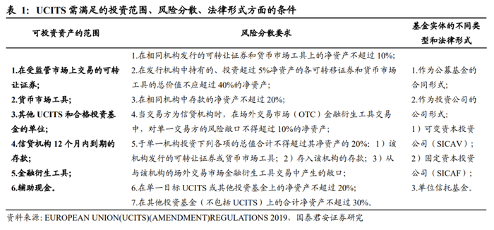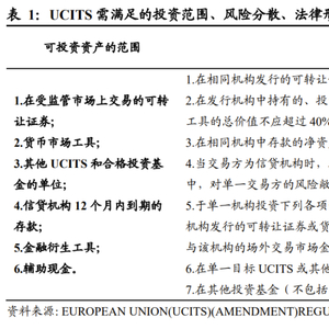 符合欧盟可转让证券集体投资计划(UCITS)条例的投资基金类似于国内的公募基金。1)欧洲的投资基金分为可转让证券集体投资计划(Undertakings for Collective Investment in Transferable Securities, UCITS)和另类投资基金(Alternative Investment Funds, AIFs)两类。其中,UCITS需满足的特点包括:从公众处获得投资资金;开放式基金;资本投资于流动性的金融资产;适用风险分散原则。2)UCITS可采用公募基金、固定资本投资公司、可变资本投资公司、单位信托基金等形式,初始资本不低于12.5万欧元。UCITS的投资者以个人投资者为主。3)原则上不符合UCITS资格的集体投资工具被指定为另类投资基金(AIFs),其特点包括:向多个投资者筹集资金;根据特定的投资策略投资。另类投资基金(AIFs)包括对冲基金、私募股权基金、房地产基金和各种其他类型的机构基金,自我管理的另类投资基金初始资产不低于30万欧元,外部管理的不低于12.5万欧元。