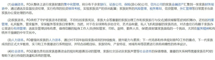 除了管资金、管投资外,FO还承担着各种服务,如税务和法律服务、监管网络安全,甚至处理敏感的“家事”(如拟定婚前协议或离婚协议,帮助继承人上任等)。因而被称为“超级富翁的超级帮手”、“富翁的智囊团”。