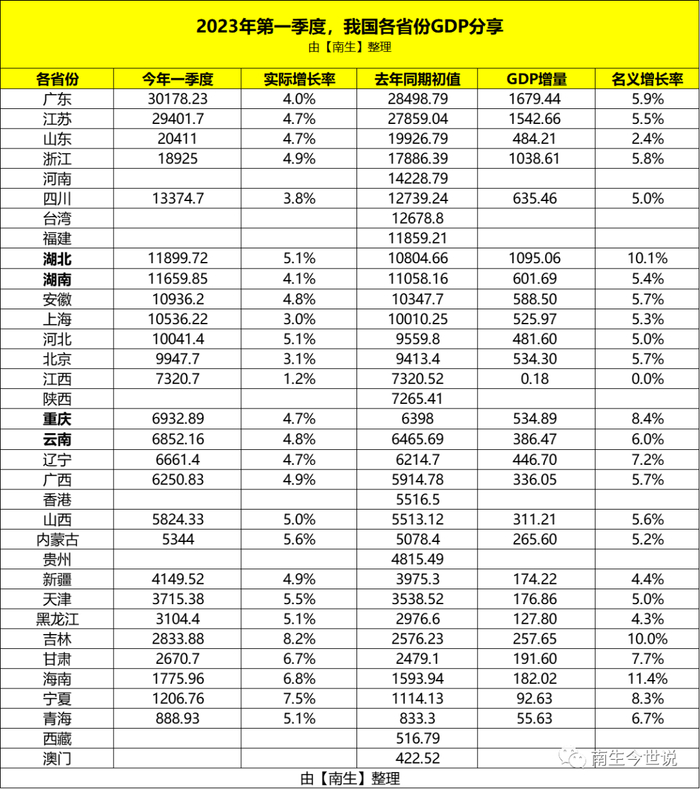 其中,河北省实现的地区生产总值为10041.4亿元,同比实际增长5.1%,名义上涨5%左右;江西省一季度完成的地区生产总值为7320.7亿元,实际增长1.2%,名义增速为零。