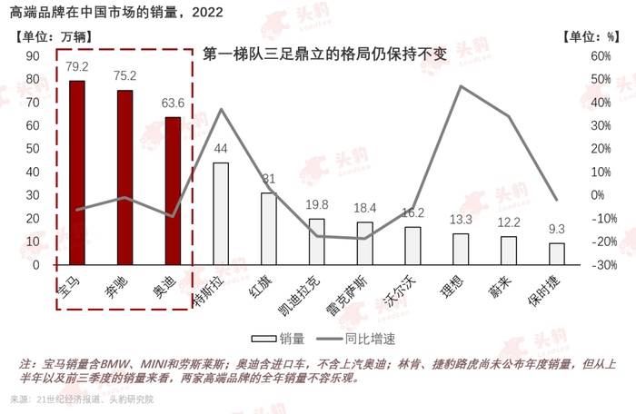 高端汽车市场格局较为稳定,但大部分高端品牌都出现了不同程度的销量下滑,或将迎来行业大洗牌,中国本土品牌或将进一步蚕食高端市场:高端汽车市场长期由“德系三强”奔驰、宝马、奥迪(BBA)保持,三家车企的市场占有率维持在80%左右,短时间内,BBA三足鼎立的格局难以撼动。2022年宝马以79.2万辆的销量继续位居BBA之首,奔驰2022年在中国销量为75.2万辆,下滑幅度收紧至0.9%,是BBA三家中下滑幅度最小的品牌,而奥迪2022年销量的下滑幅度最大,为9.3%。
