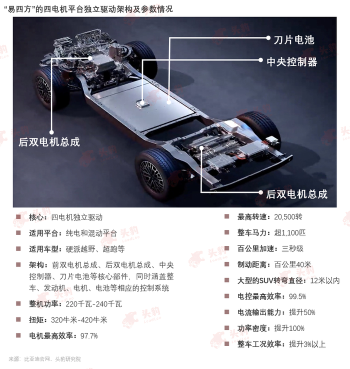 “易四方”分布式驱动平台,未来将率先标配搭载于仰望品牌的全系车型,是仰望品牌的关键核心技术:易四方架构由中央处理器、前双电机、后双电机和刀片电池组成,并由比亚迪100%自主研发而成,适用于纯电及混动平台,全面覆盖硬派越野、超跑等多款产品。