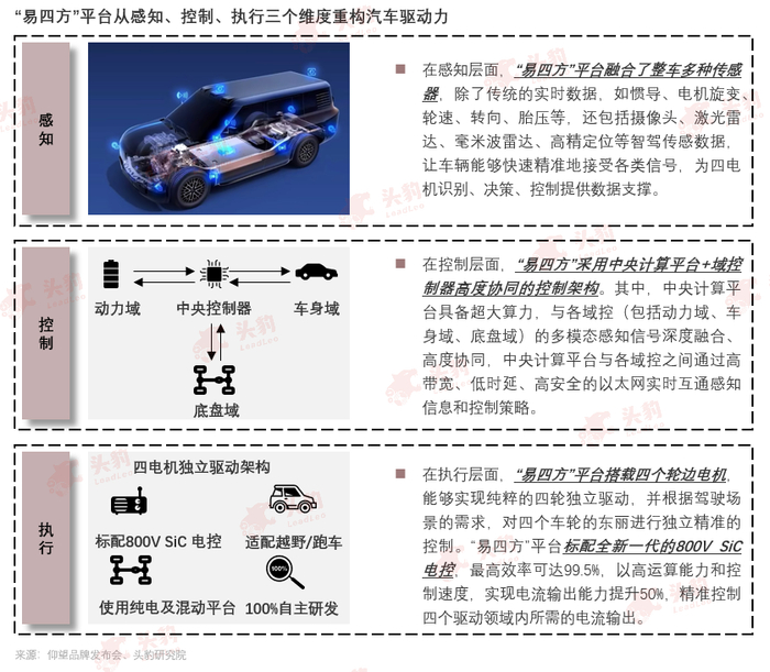 “易四方”平台集成了车辆电子控制、人工智能、云计算、大数据等多种先进技术,从感知、控制、执行三个维度围绕新能源汽车的特性进行了全面重构,颠覆了以往燃油车的动力系统能力体系:在感知层面,“易四方”应用多种技术,可全方位感知车辆熟悉周围环境,实现智能化的驾驶辅助、自动驾驶、个性化的驾驶辅助和智能化的出行服务等;在控制层面,“易四方”综合应用了车辆电子控制技术、智能控制算法技术、远程控制技术、车辆安全技术等,实现对车辆的高效控制和管理;在执行层面,“易四方”搭载四个轮边电机和800V SiC 电控,提高自主执行能力。正是在感知、控制和执行三个层面的全面创新,让“易四方”拥有了四电机独立驱动、极限防滑控制和车身稳定性控制三大核心控制技术。