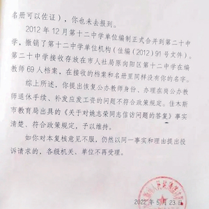 但佳木斯第二十中学在2021年12月出具的《关于对姚志荣同志信访问题的答复》中称,2004年佳木斯市人民政府将原第十二中学的管理权限划归市教育局管理时,接收到的人员名册中没有姚志荣的名字。