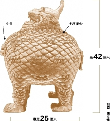 付博告诉记者,沈阳故宫博物院珍藏的清代甪端为一对,铜质鎏金,高42厘米,腹宽25厘米,呈直立昂首狮兽样貌。