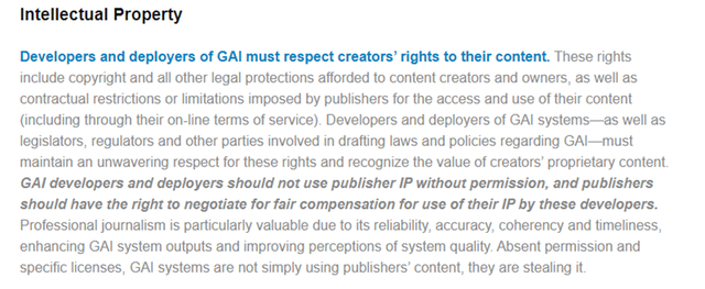生成式AI的开发者和部署者,必须尊重创作者对其内容的权利:这些权利包括版权,提供给内容创建者和所有者的,所有其他法律保护,以及出版商对访问和使用其内容施加的合同限制或通过其在线服务条款。
