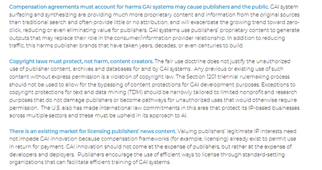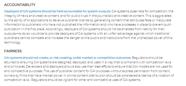 生成式AI厂商应该对其产品负责:生成式AI厂商对竞争、新闻和创意内容的完整性,以及公众对新闻和创意内容的信任构成风险。AI 应用程序生成的内容将虚假或不准确的信息归于出版商这是不负责任的行为。因此,不应免除生成式AI的部署者对其输出的责任,这样做会给生成式AI产品,提供传统出版商无法与之竞争的不公平优势,并增加不受约束的权力对公众和机构造成危险。