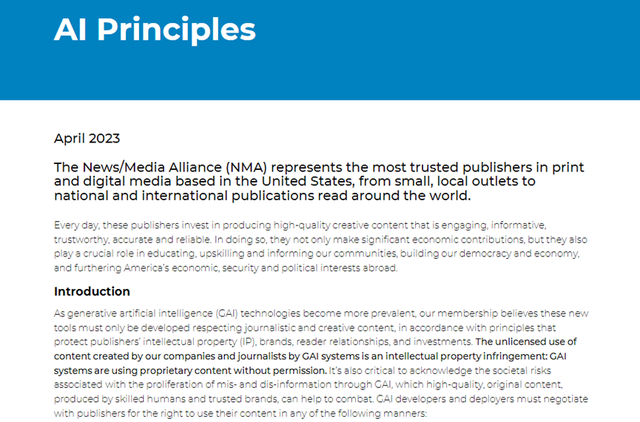 近日,美国新闻/媒体联盟(The News/Media Alliance,简称“NMA”)代表近2000家印刷和数字媒体出版商正式发布了,生成式AI监管原则。