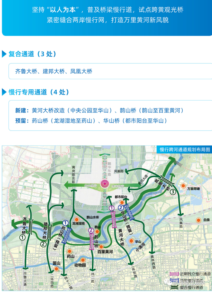 其中,黄河大桥(连接二环东高架)、鹊山桥(连接黄岗路)的独立慢行通道为近期规划。这意味着,未来不久后大家将可步行到黄河大桥上,万里黄河的壮观景色。