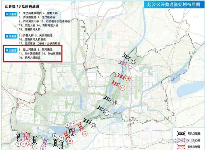 规划显示,起步区已经通车、在建、规划的跨黄通道共有18条。