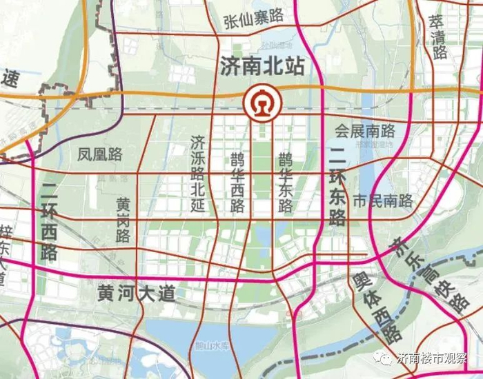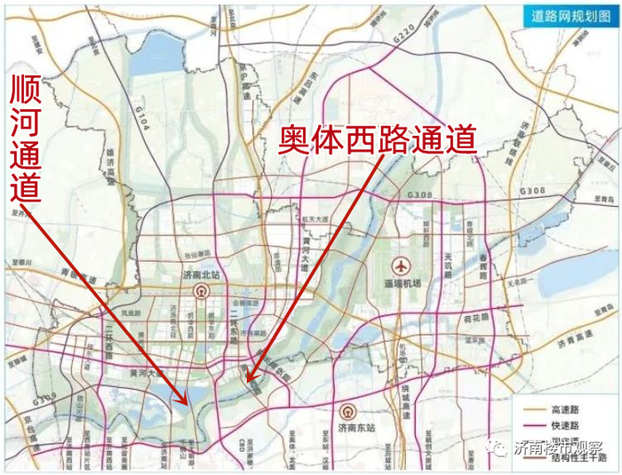 一个是连通老城区的顺河通道,从规划图看它向北连通起步区的济南北站,向南连通老城区的顺河高架,未来可构筑一条从起步区到大明湖、趵突泉等老城核心区的动脉。