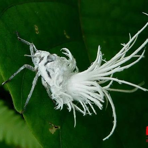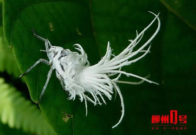 这形似“小白花”的害虫是白蛾蜡蝉的若虫(幼虫),它身上的白色丝丝是腹部分泌出来的蜡丝,主要为防止鸟类吃掉自己。白蛾蜡蝉喜欢刺吸龙眼、芒果、荔枝等果树的汁液,因此在我市种植果树较多的中山东路、东堤路,以及河东公园、柳侯公园和龙潭公园等地,都能看到它的身影。