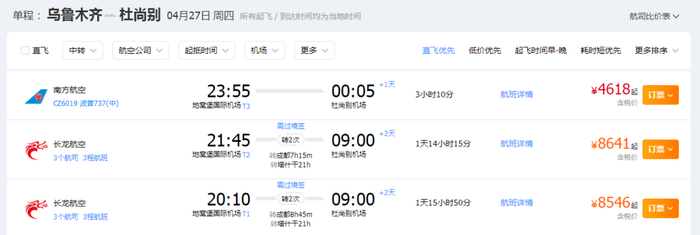 记者经检索发现,目前,乌鲁木齐—杜尚别航班目前较为充裕,中国南方航空显示有直达航班,且5月1日航班票价较低。