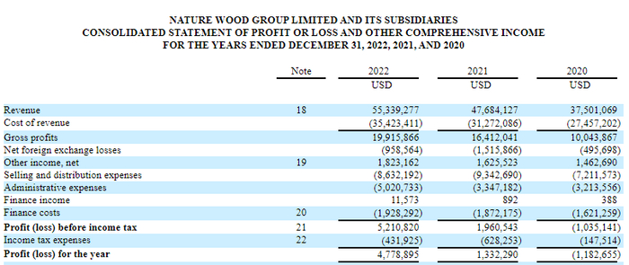 招股书显示,在过去的2020年、2021年和2022年,Nature Wood的收入分别为3,750.11万、4,768.41万和5,533.93万美元,相应的净利润分别为-118.27万、133.23万和477.89万美元。
