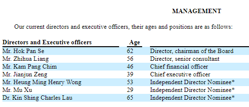 Mr. Kam Pang Chim, age 46, is our chief financial officer, and is primarily responsible for formulating corporate strategies, overall management of financial, mergers and acquisitions and capital market affairs of our Group. Mr. Chim has over ten years of experience in finance performance control, multi-location finance team management and fundraising. Mr. Chim has worked as the chief financial officer of a subsidiary of our Group since September 2019. Prior to joining our Group, from August 2009 to January 2019, Mr. Chim served in the positions of chief financial officer in an OTC trade public company in the U.S. and a then HK listed company, and was primarily responsible for initial public offerings, strategic planning, business model development and finance management. Mr. Chim obtained his Bachelor of Business Administration degree from Lingnan University in November 2003.