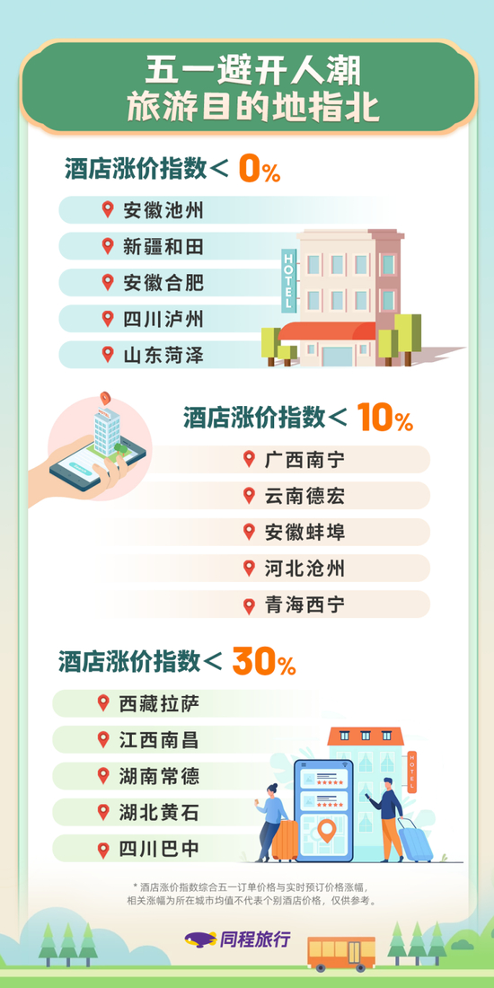 如何避开人潮、出游性价比高是人们“五一”出行最关注的问题之一。同程研究院综合参考“五一”期间酒店订单价格与实时预订价格涨幅,给出酒店涨价指数较低的旅游目的地,供用户选择。