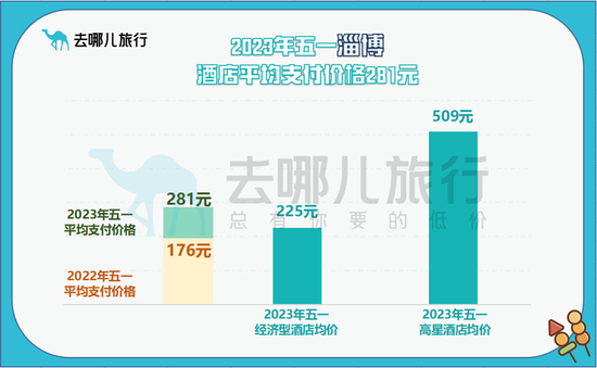 假期前夕,淄博的酒店价格相对比较友好。去哪儿平台上,4月至今,淄博当地酒店每晚均价约206元,同比涨约30%。截至4月16日,平台上淄博“五一”假期酒店预订量同比增长18倍,平均房费为281元。其中高星酒店平均支付为509元,经济型酒店平均支付价格为225元。淄博作为性价比旅游目的地,选择经济型酒店的用户占总量五成。