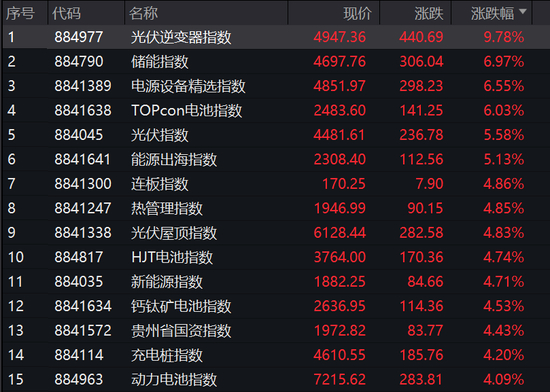 26日上午,储能、锂电池、光伏等板块集体走高。光伏逆变器指数领涨行业板块,收盘涨幅达到9.78%,储能、电源设备、TOPcon电池指数、光伏指数、能源出海指数等收涨超5%。