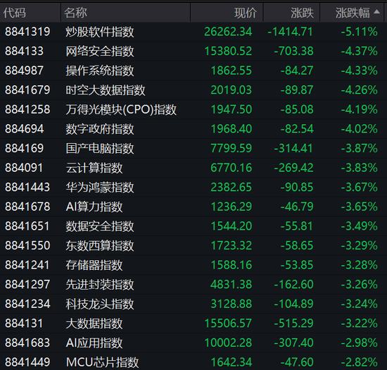 板块上,数字政府指数、国产电脑指数、AI算力指数、华为鸿蒙指数、存储器指数跌幅均超过3%。