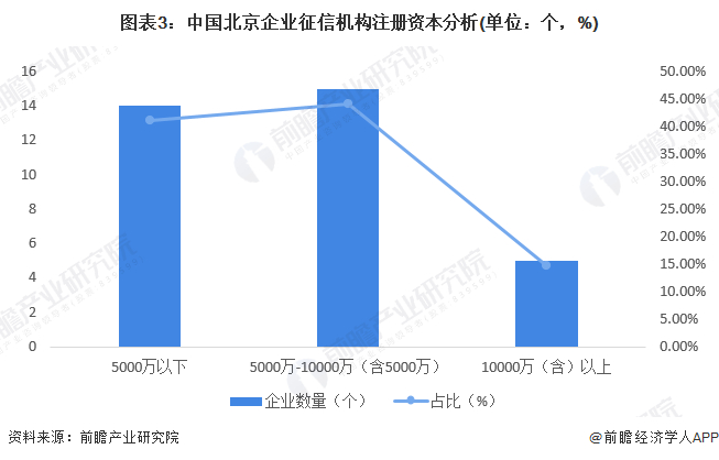 根据中国人民银行公布数据,截至2022年8月末,中国北京市共有35个企业征信机构,为中国征信机构最多的地区。通过对北京市各机构注册资本分析,可以看出接近90%企业注册规模在10000万以下,其中5000万以下企业占比41.18%,征信机构规模整体能级较小。