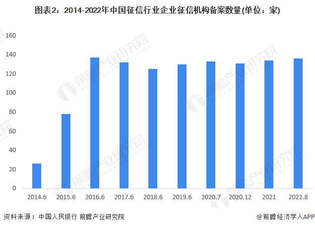 自2016年后,中国征信行业企业征信机构数量维持在130家左右,整体数量较少,此外,企业量级较小。截至2022年8月末,在人民银行分支机构备案的企业征信机构136家。而我国个人征信机构目前只有百行征信和朴道征信两家获得牌照,钱塘征信正在申请我国第三张个人征信经营牌照。